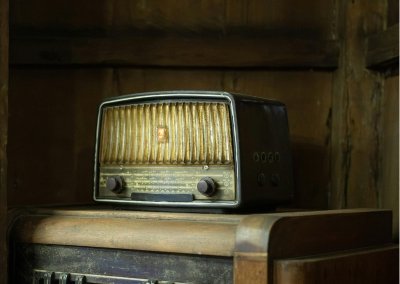 Rádio antigo com gabinete de madeira e botões analógicos frontais